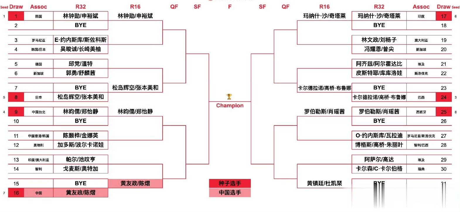 混合双打是本届赛事阵容最齐整、关注度最高的双打项目,头号种子为韩国王牌组合林钟勋/申裕斌,二号种子是中国香港老牌强档黄镇廷/杜凯琹,三号种子为巴西的情侣搭档雨果/高桥布鲁娜,四号种子是中国台北组合林昀儒/郑怡静。中国组合黄友政/陈熠以七号种子身份进入2/4区,首轮比赛轮空,1/4决赛中极有可能会碰上中国台北的林昀儒/郑怡静。