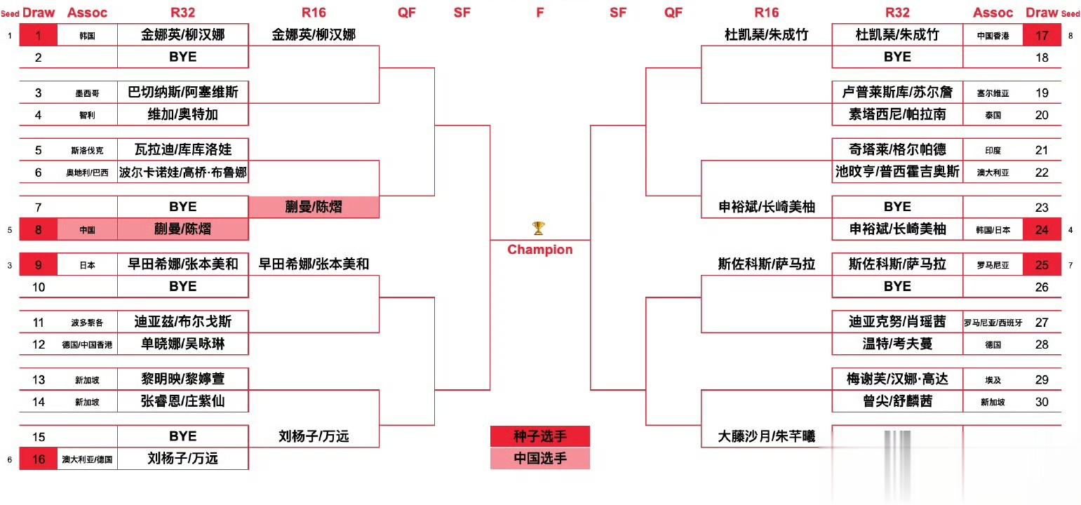 女子双打签表中,头号种子由韩国组合金娜英/柳汉娜占据,处于1/4区;二号种子为日本新生代组合早田希娜/张本美和,落入2/4区;三号种子是中国香港组合杜凯琹/朱成竹,位于3/4区。中国组合蒯曼/陈熠同样被分在1/4区,与头号种子韩国组合同区,该区内还有奥地利与巴西选手组成的跨国组合波尔卡诺娃/布鲁娜。首轮比赛国乒组合轮空,第二轮极有可能会碰到波尔卡诺娃/布鲁娜的跨协会搭档。