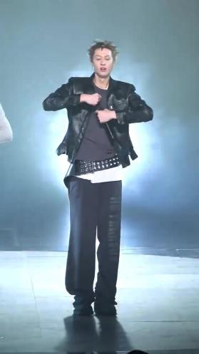 CORTIS 的穿搭最鲜明的标签是多元融合,其中讨论度最高的 “轻朋克暗黑风” 极具代表性。他们摒弃了传统朋克的尖锐攻击性,将 Vivienne Westwood 的格纹美学、Rick Owens 的暗黑先锋剪裁与 Julius 的皮革质感相融合,用铆钉、破洞、金属配饰等元素营造叛逆氛围,却又通过少年感的演绎中和了锋利感。队长 MARTIN 凭借 190cm 的身高和漂白刺头,将黑色修身皮衣与十字架项链的搭配演绎得如同《NANA》中的本城莲,被网友称为 “人间本城莲”,他身上的中古款 Vivienne Westwood 单品更是引发古着热潮,让 “古着哥” 的昵称广为流传。