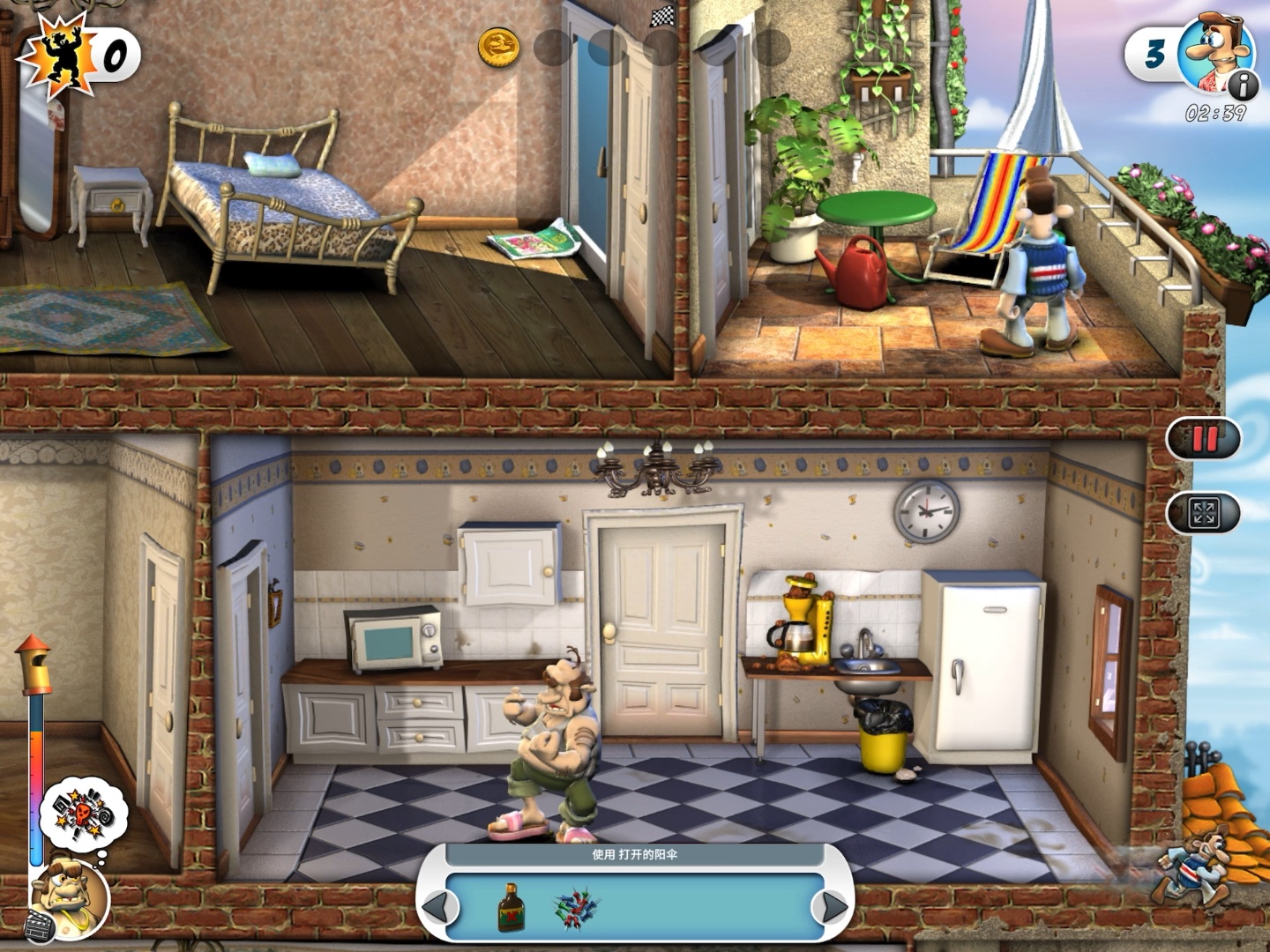 游戏玩法玩家扮演伍迪,在邻居家中完成一系列恶作剧来获得收视率以通关。需要利用邻居家里的物品设置陷阱,如把胶水涂在望远镜上、将鸡蛋放在微波炉里加热等。同时要避免被邻居或其宠物发现,可利用大厅的大柜子、卧室的床下等地方藏身。每完成一个恶作剧会有冷却时间,在冷却时间内完成另一个恶作剧可获得加分。