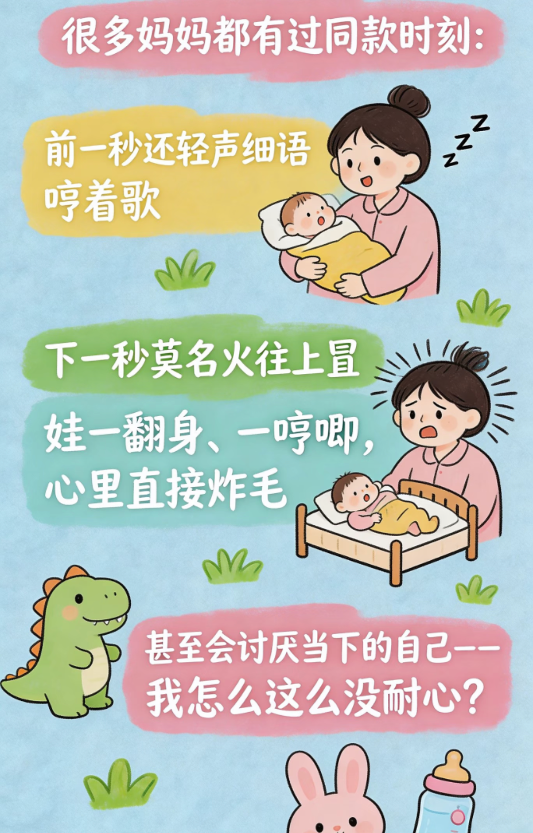 其实,这种“哄睡时的莫名烦躁”,真的太正常不过了。它不是你脾气坏,更不是你不爱孩子,它只是一个普通人,在承受了巨大的身心消耗后,发出的一声求救信号。我们不必为此感到羞愧,也不必给自己贴上“坏妈妈”的标签。有时候,承认自己累了,允许自己烦躁一会儿,反而能让情绪找到一个出口。试试看,当那股火苗再次燃起时,别硬撑,把孩子先安稳地放在床上(确保安全),自己去客厅喝杯水,或者去阳台深呼吸一分钟,让紧绷的神经缓一缓。也可以提前和队友沟通好,约定好“轮班制”,今晚你上半夜,我下半夜,给自己一个可以安心休息的盼头。哪怕只是用手机放一首自己喜欢的歌,戴上耳机,暂时隔绝孩子的哭声几秒钟,给自己充充电,都是可以的。