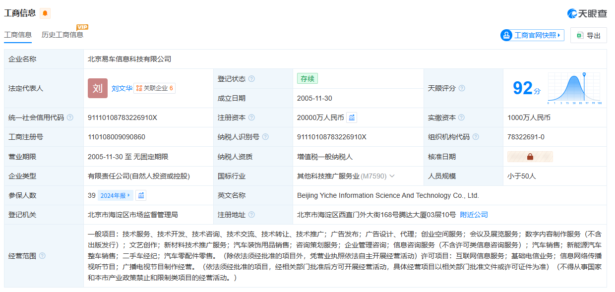 资料显示,北京易车信息科技有限公司成立于2005年11月,法定代表人为刘文华,注册资本达2亿人民币,经营范围十分广泛,不仅涵盖创业空间服务、会议展览、数字内容制作、企业管理咨询等常规服务,还涉及新能源汽车整车销售、二手车经纪、汽车零配件零售以及互联网信息服务等汽车相关业务,与汽车行业有着深度关联。