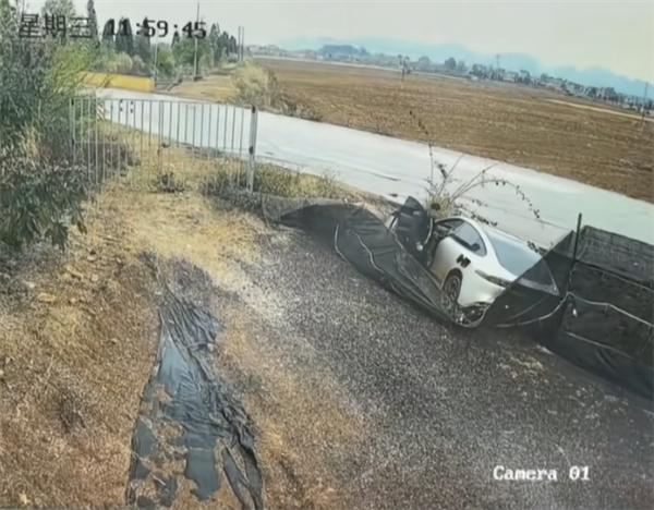 伴随着一阵刺耳的摩擦声,车辆侧滑甩尾,冲出路面,撞倒了路边防护网,车身瞬间倾斜,车轮还在微微转动。