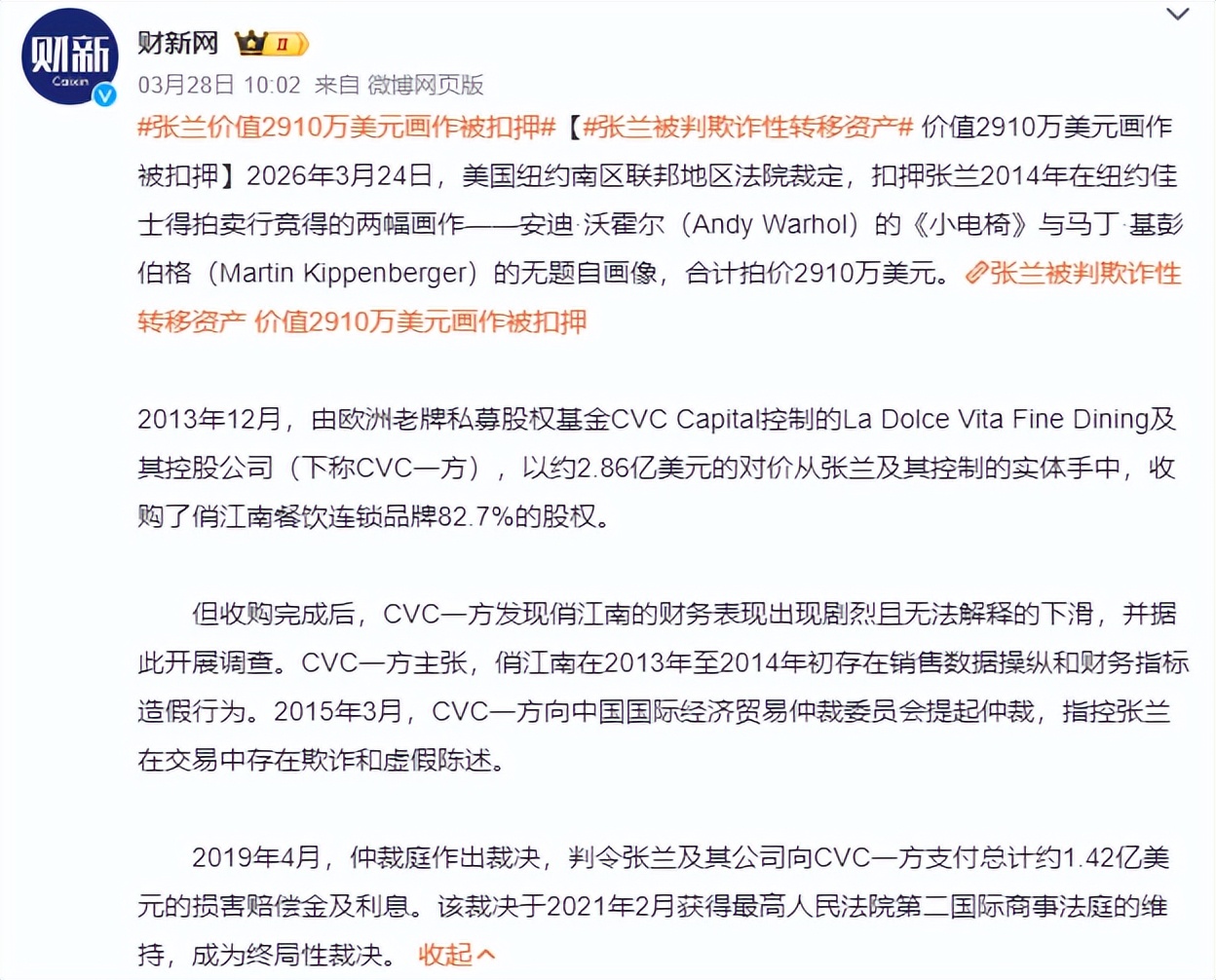 终审裁决最近张兰身上的麻烦事儿还真不少,尤其是两幅画作被扣押的事儿对品牌的声誉影响真的很大。
