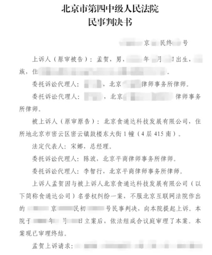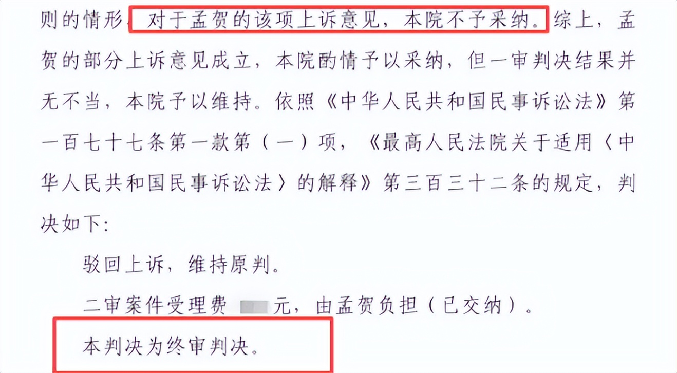 可以看到他把上诉的意愿打码了,判决结果可以看出,法院拒绝采纳,一审判决没有任何不合理的地方,孟先生的判决被驳回了。