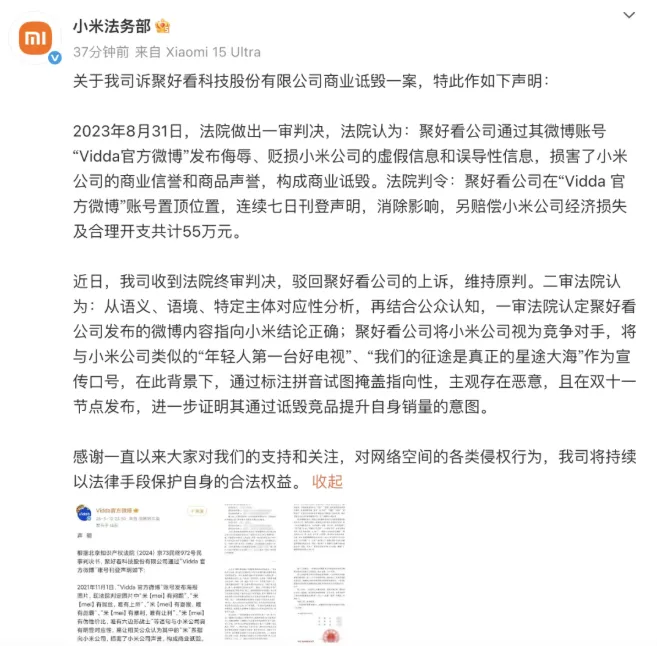 此前,小米法务部多次发文,宣布胜诉并获赔的消息。2025年5月13日,小米法务部发文称,关于公司诉聚好看科技股份有限公司商业诋毁一案,法院判决认为,聚好看公司通过其微博账号“Vidda官方微博”发布侮辱、贬损小米公司的虚假信息和误导性信息,损害了小米公司的商业信誉和商品声誉,构成商业诋毁。聚好看公司在“Vidda官方微博”账号置顶位置,连续七日刊登声明,消除影响,另赔偿小米公司经济损失及合理开支共计55万元。