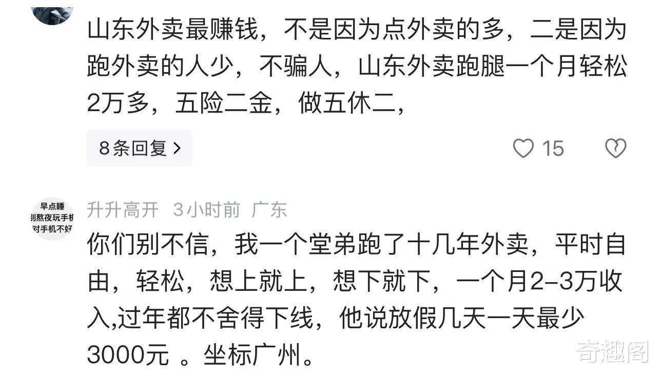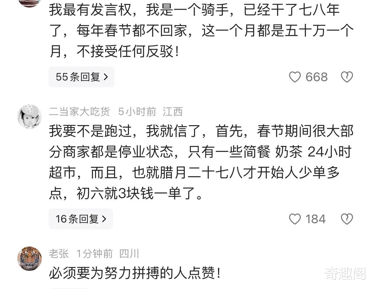 但是评论区也不乏质疑之声,有网友表示:“要不是自己跑过外卖,差点儿就信了。”一位质疑者认为,虽然春节期间单价高,但平均到每天、每单,要想达到人均月入2万(合计日入600多元)的水平,对于普通骑手来说,几乎是不可能完成的任务,属于极少数能吃苦的“单王”才能达到。