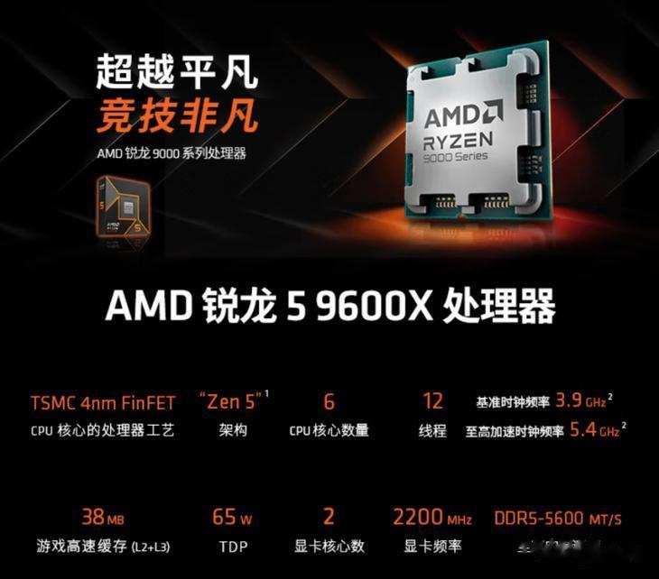 AMD 锐龙5 9600X处理器采用了先进的TSMC 4nm FinFET工艺制程,搭配全新的Zen5架构。这一组合使得锐龙5 9600X在性能和能效上都有了显著提升。它拥有6核心12线程的配置,基础运行频率为3.9GHz,最高可加速至5.4GHz,这样的高频率能够确保处理器在面对复杂任务时依然能够游刃有余。AMD 锐龙9000系列处理器适用于AM5插槽,支持PCIe 5.0和DDR5内存,AMD承诺这一代至少可以用到2027年+,让大家可以放心战未来。
