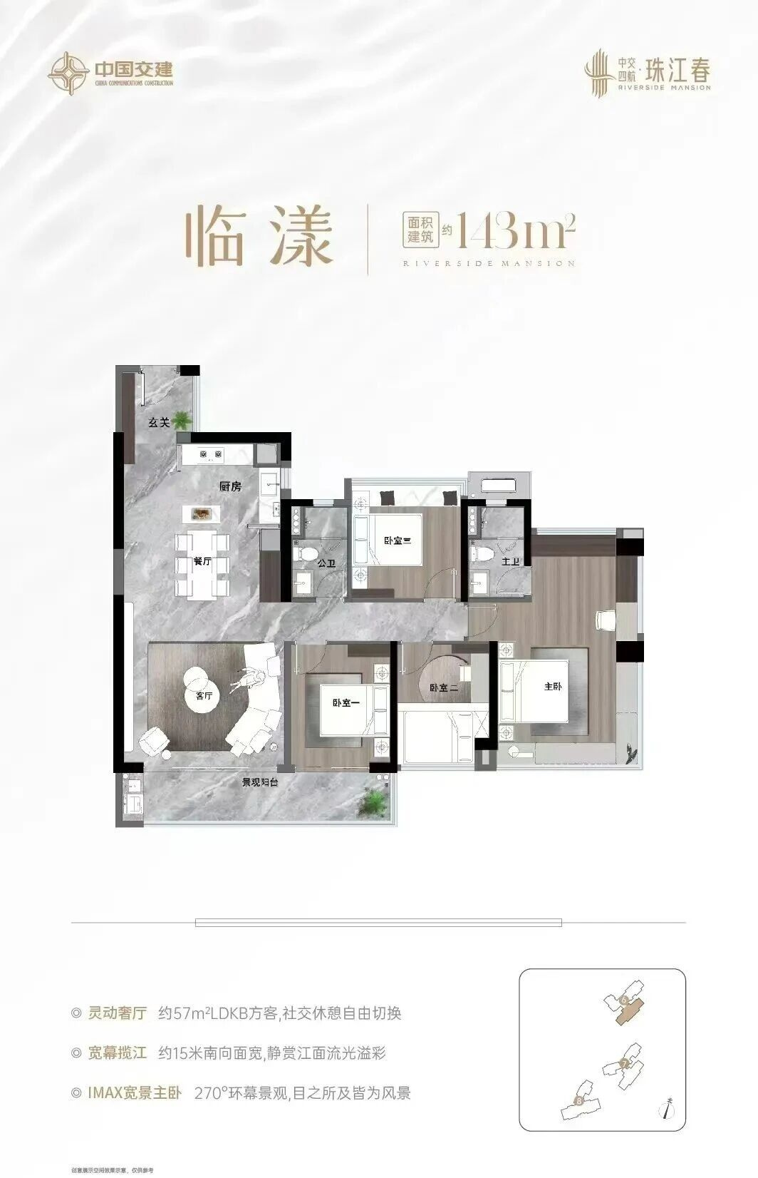 建面143平,只有6栋两条梯腿,总共82套,客厅与旁边灵动空间打通后,可以做到59平的阔绰空间,四开间约15米的南向采光面,南向视野与其它楼栋遮挡较少,这个户型10楼以上就能无遮挡望江了。