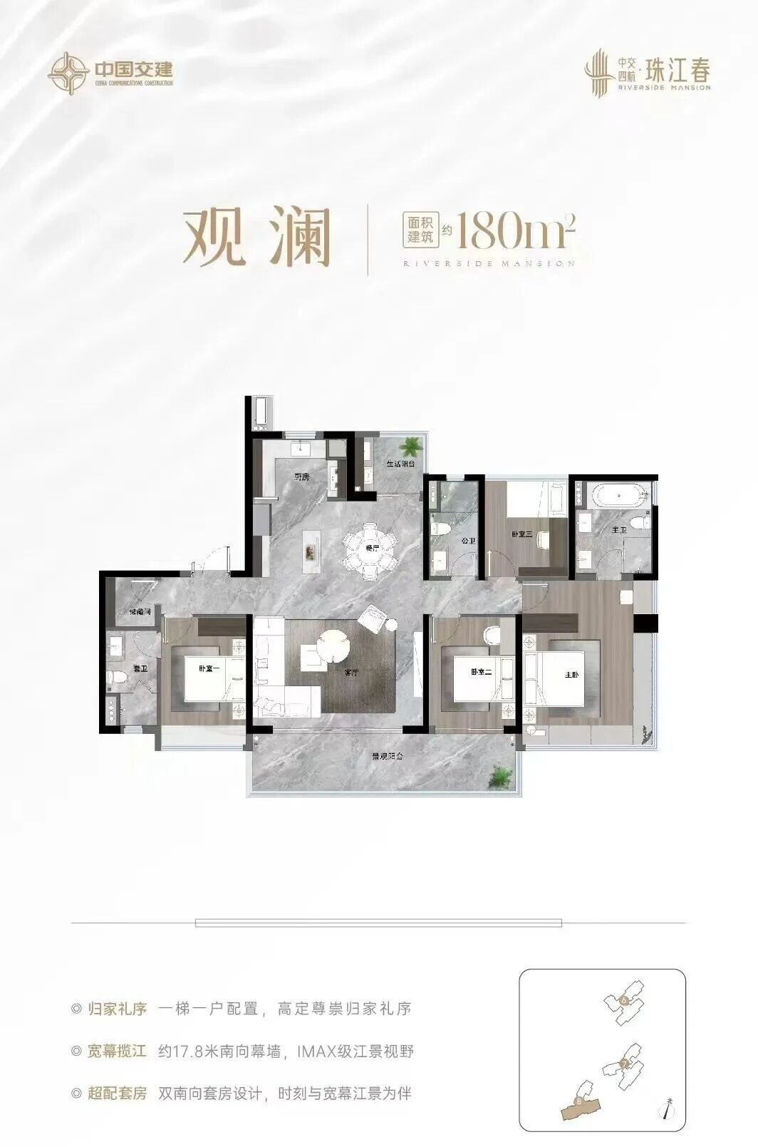 建面180平,8栋两条梯腿共84套,买了这个户型,就能直接解锁专属电梯厅、南北对流双阳台、一梯一户设计、滨江头排、8.7米超长采光+最低6-7小时日照等“类板楼”居住体验。