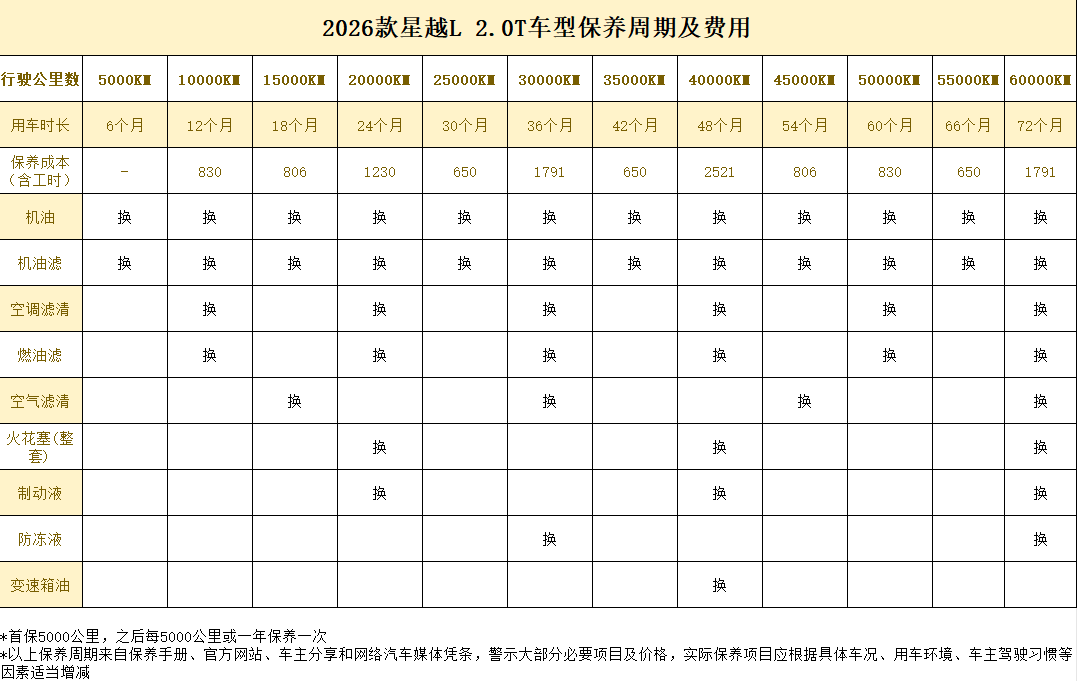 吉利星越L在紧凑型SUV领域有着不错的市场表现,2026款车型也在前不久上市,价格和配置上都有所调整,性价比看着确实很高。其中保养成本是大家买车前关注得比较多的事情,2026款车型均以2.0T发动机为动力,搭配8AT变速箱,今天为车友们罗列一下吉利星越L的常规保养项目和大约价格,让大家在选车和保养时心中有数,少花冤枉钱!
