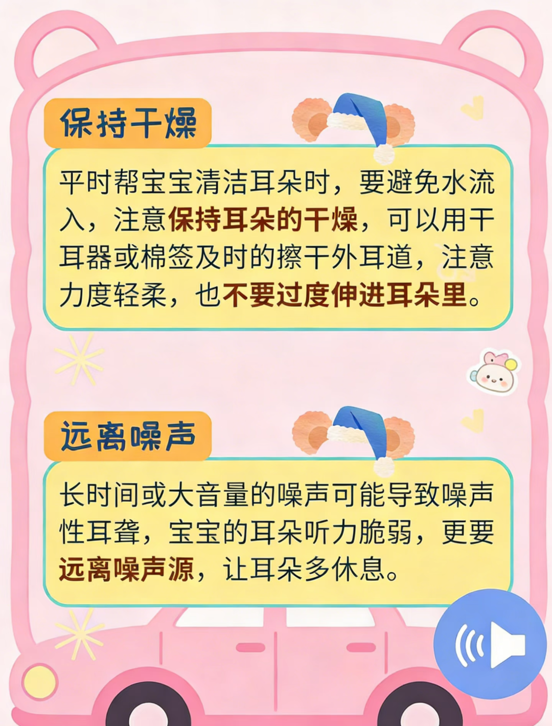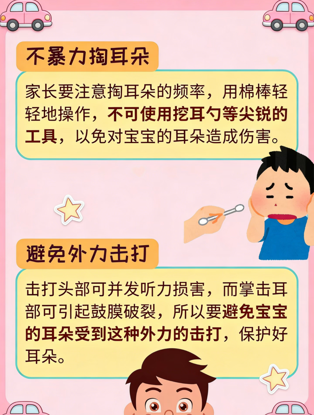 小小的耳朵,是宝宝感知爱与世界的桥梁。我们的细心照护,便是为这座桥梁筑起最温柔的护栏。每一次轻柔的擦拭,每一次对噪音的留意,每一次对打闹的看护,都是在守护宝宝清澈的听觉世界,让他们能够安心地聆听爸爸妈妈的呼唤,感受大自然的风声雨声,在未来健康快乐地探索这个充满美妙声音的世界。爱在细节中,呵护就从今天开始吧。