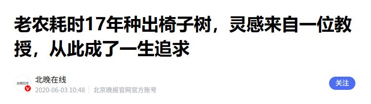 北晚在线 2020-06-03——老农耗时17年种出椅子树,灵感来自一位教授,从此成了一生追求
