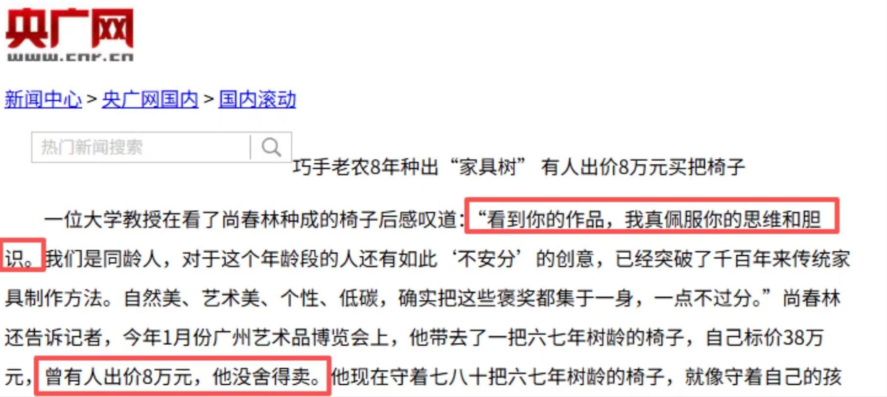 八万块钱都不卖2015年,尚春林带着他这把独特的“生态椅”去参加一个展会,一下子就引起了大家的关注。