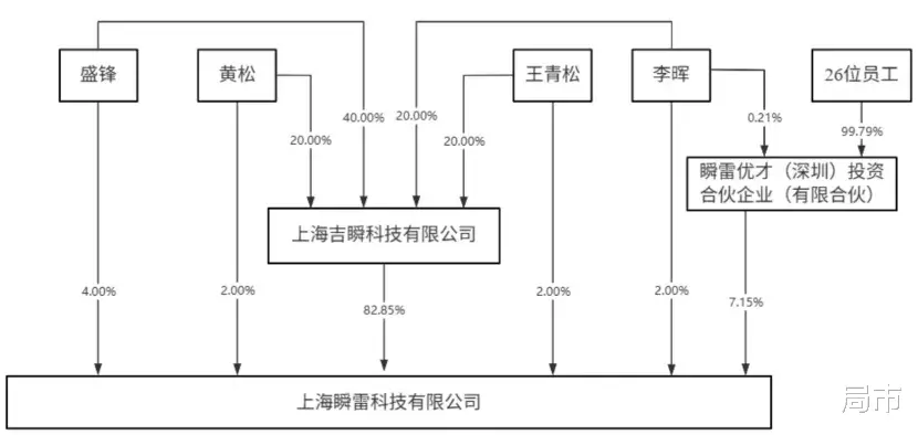 标的公司瞬雷科技的股权结构较为简单,第一大股东吉瞬科技持有其82.85%的股权,实控人盛锋及其他三名高管直接持股合计10%,员工持股平台瞬雷优才持有剩余7.15%。控股股东吉瞬科技是一家有限责任公司,其股权由标的公司四名高管100%持有。