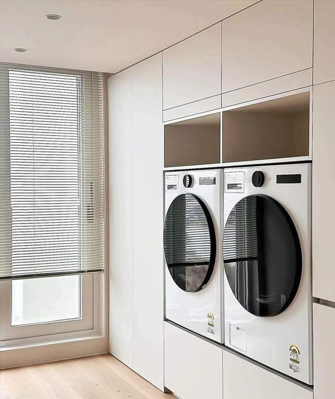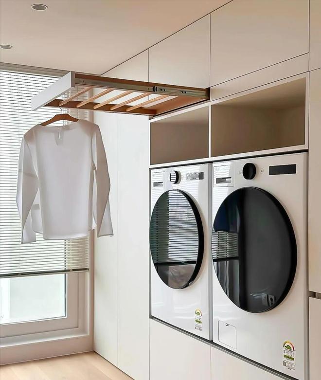 与此同时,在洗衣机和烘干机的上面做一排抽拉晾衣杆,用于晒衣服。