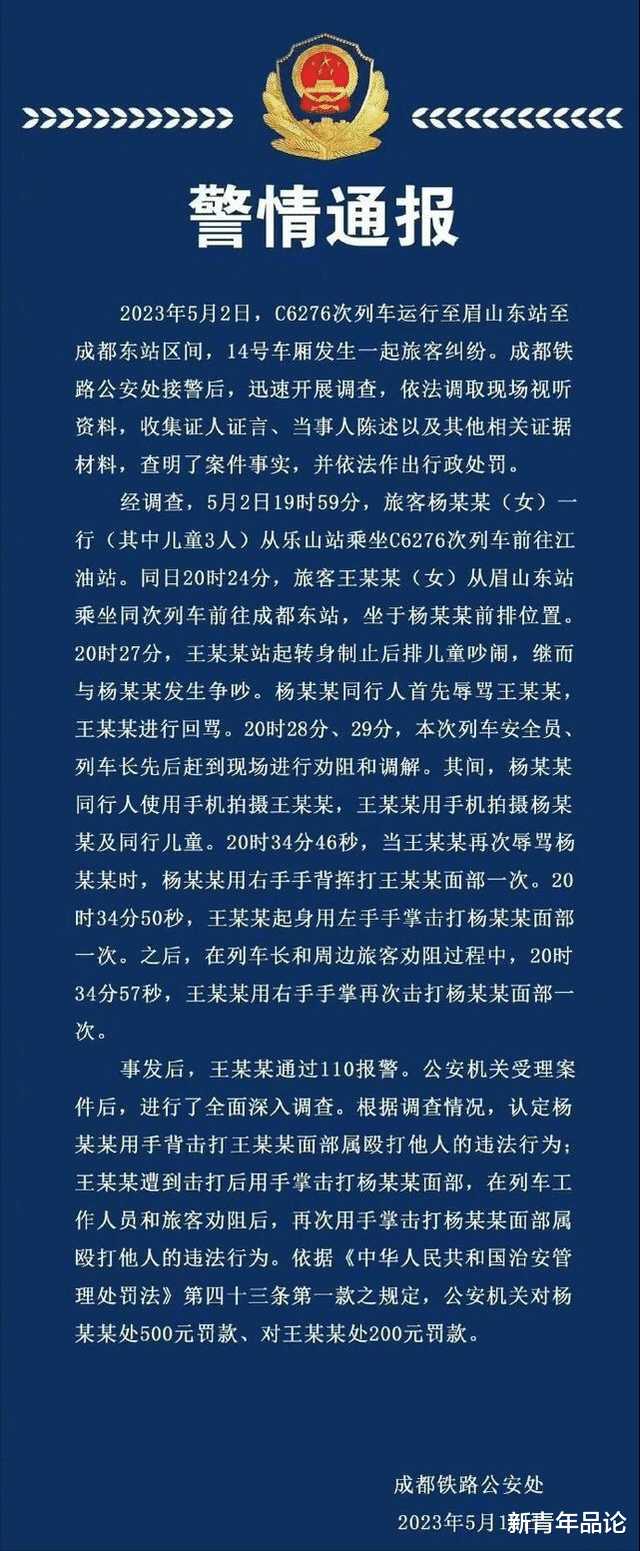 近日,成都铁路公安局针对一起案件的“互殴”认定引发网络关注。5月2日,一女子发视频称,当天乘坐C6276次列车,途中因制止“熊孩子”撞椅背遭到对方家长掌掴。然后女子还击,最终成都铁路公安认定为互殴,引起网民热议,具体细节我们不详细说了。