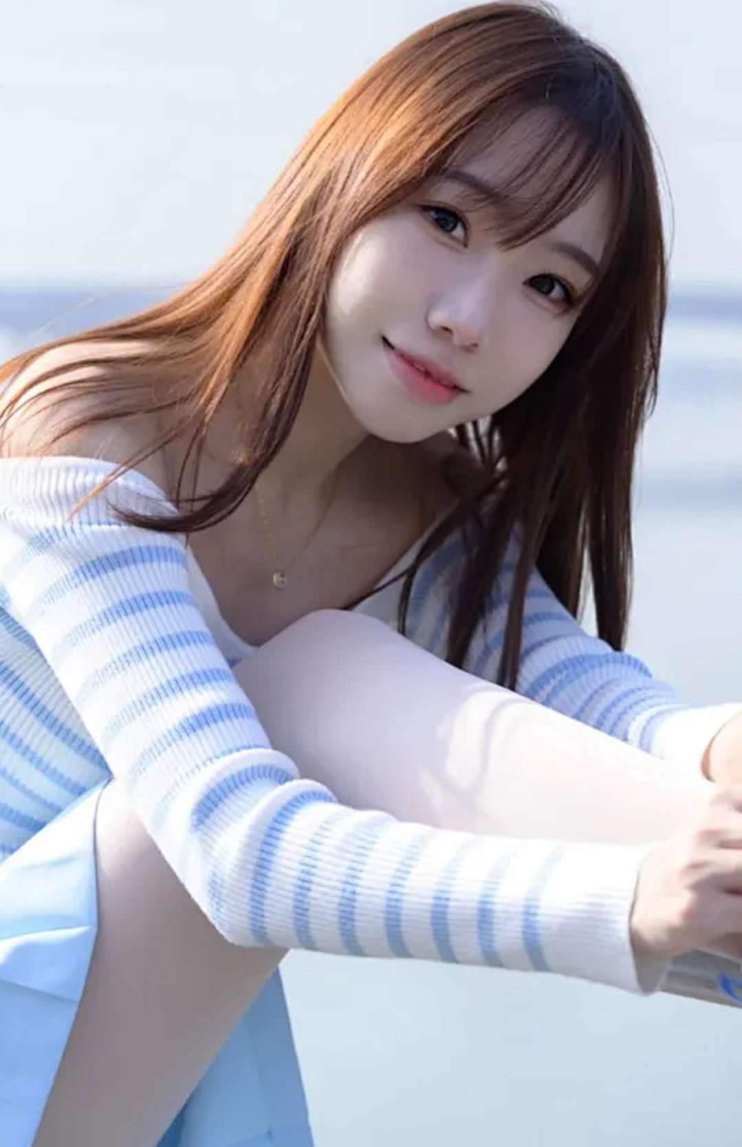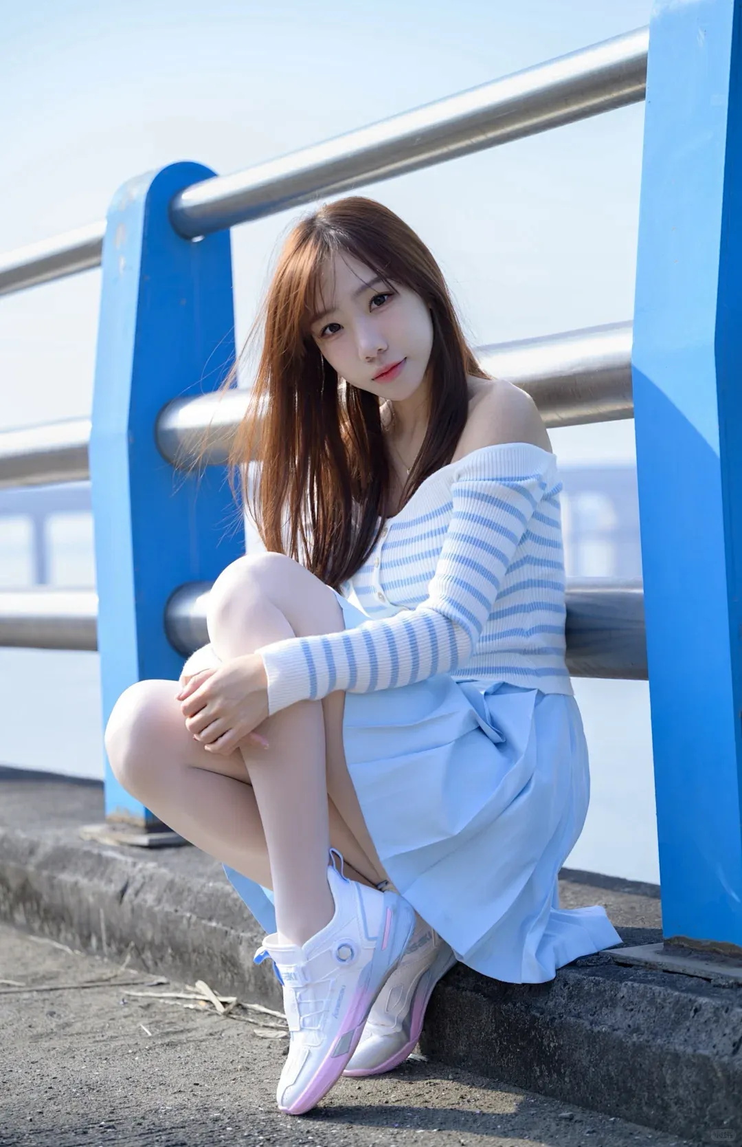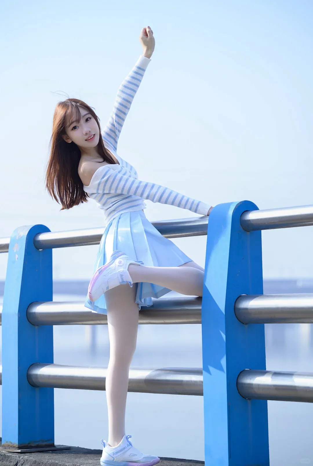 第二款蓝白条纹上衣,搭配浅蓝百褶短裙,姿态俏皮活泼。蓝天碧水背景下,尽显甜美活力,是典型的“青春甜美少女风”