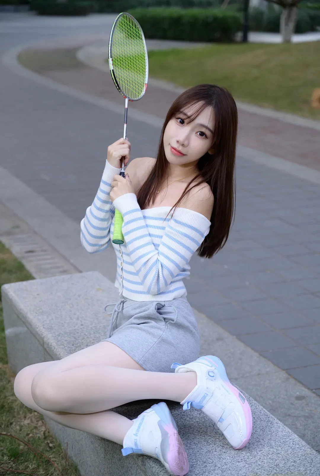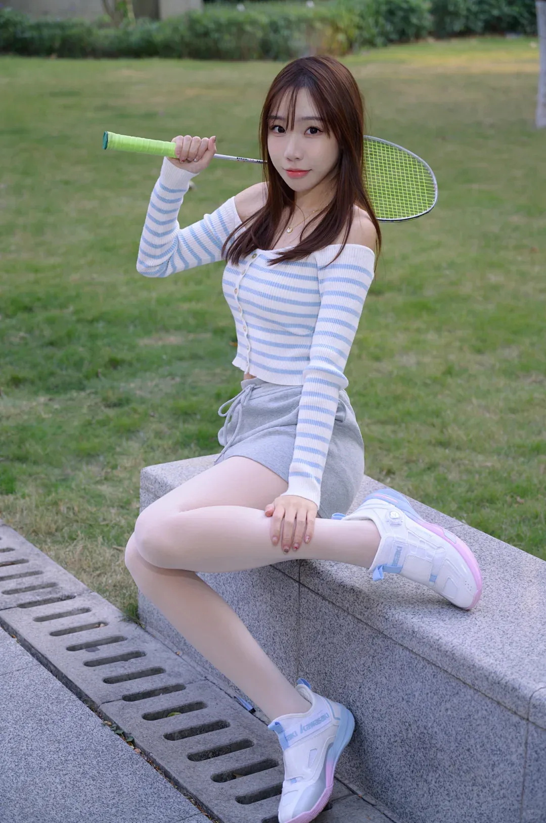 第一款蓝白条纹露肩上衣搭配浅灰短裤与白色丝袜,脚穿拼色运动鞋。在绿意盎然中,休闲中透着小性感,属“运动休闲风”。