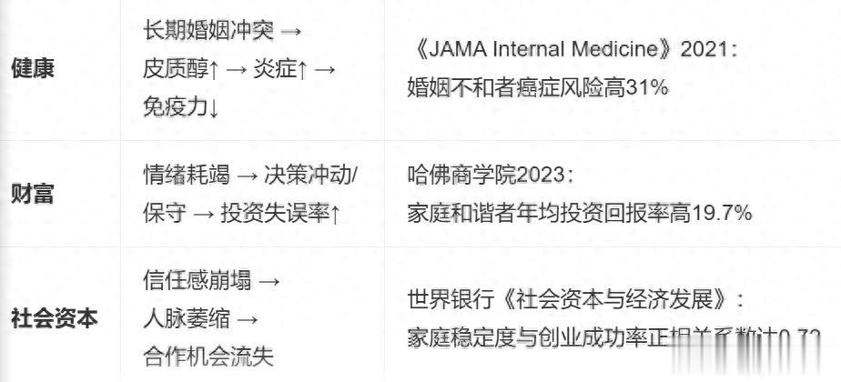 1、情绪与生理关联,长期婚姻冲突显著提升皮质醇(压力激素)水平,导致失眠、免疫力下降、慢性炎症,与“百病缠身”高度吻合。2、决策与财富影响,家庭不和者专注力下降37%(哈佛家庭经济研究,2023),易错失商业机会,财务决策更趋保守或冲动。3、社会信任机制,对伴侣的背叛或冷暴力,会外化为“不可靠”社会标签,影响合作、融资与人脉资源获取。4、寿命差异,婚姻幸福者平均寿命比冲突频繁者长7–10年(《柳叶刀》家庭健康研究,2022)。