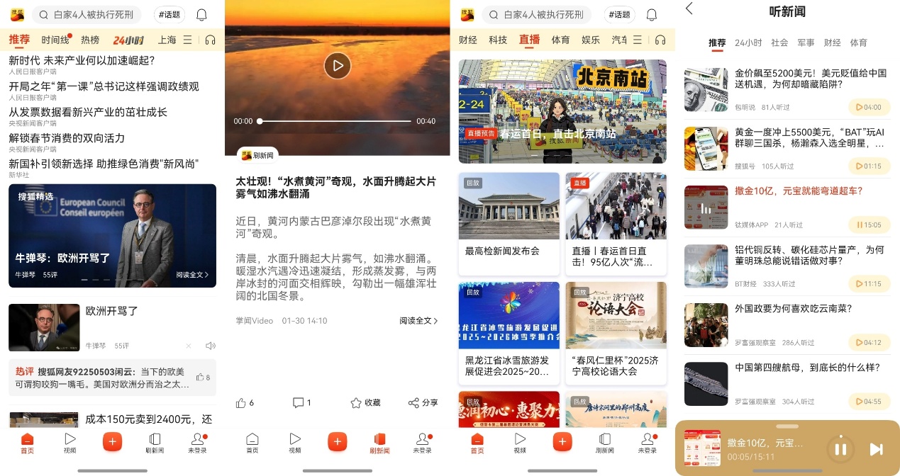 另一款我常用的新闻App,搜狐新闻的鸿蒙版本,同样也在高速进化。一年前,首页仅支持图文和视频类型,经过快速“查缺补漏”,现在已经补充了“听新闻”、“看直播”等更丰富的资讯方式。