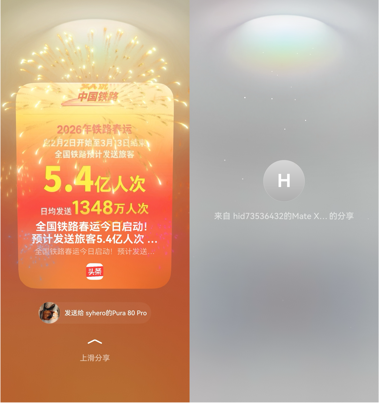 更令人惊喜的是,HarmonyOS 6的创新特性算是被鸿蒙版今日头条玩明白了。华为账号一键登录,省去了输密码的麻烦;以前看到好内容想分享给好友分享,得点击分享、复制链接、粘贴发送,非常繁琐,现在两台鸿蒙手机头对头一碰,正在刷的视频、文章直接“飞”到朋友手机上,这操作真的太帅了!