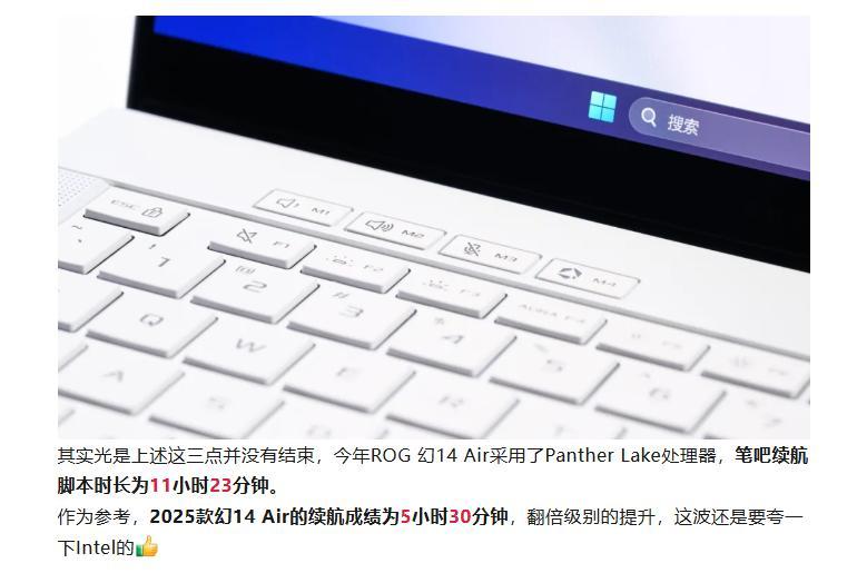 首先来看看最为炸裂的续航升级,ROG幻 14 Air 2026 搭载英特尔酷睿 Ultra 9 386H 处理器,基于全新 Panther Lake 架构,采用 Intel 18A 制程,相比上代在能效比上有明显提升,因此在73Wh电池容量与上代基本持平的情况下,实测续航确迎来了几乎翻倍的提升,在笔吧评测室的日常办公仿真脚本测试成绩为11小时23分钟,而上代为约为5小时30分钟,对于一款专业性能轻薄本而言,这样的续航还是相当优秀的,甚至可以媲美Macbook了,而且ROG还随机附赠300W主充电器与100W PD便携充电器双充方案,非常实用。