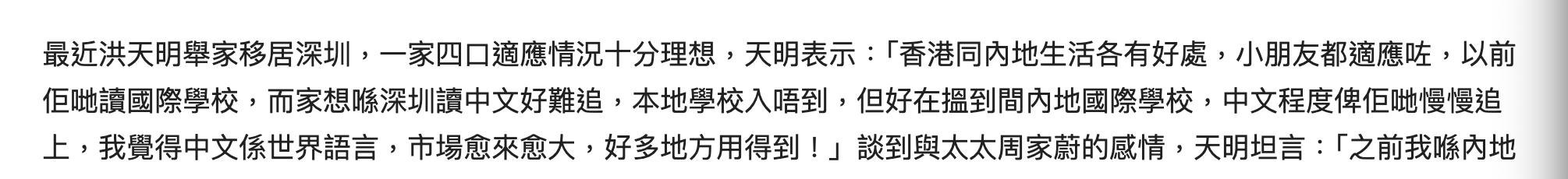 洪天明一家人兴师动众从香港搬到深圳,最主要的原因就是希望一家人能够在一起生活,不要分隔两地。过去几年洪天明因为长期在内地发展,为了节省来回的时间,他大部分时间都在内地生活。其妻子周家蔚曾经透露洪天明有时候半年才回来一次,而且回来的时间很短暂,一家人过的就是两地生活。由于长期分隔两地,这些年还不时地有夫妻不和的传闻。洪天明大概也是意识到了问题的严重性,不说夫妻俩是不是真的因此不和,但他的确牺牲了与家人的相处时间,思前想后,最好的办法就是让妻子儿子搬到深圳,一家人在深圳生活