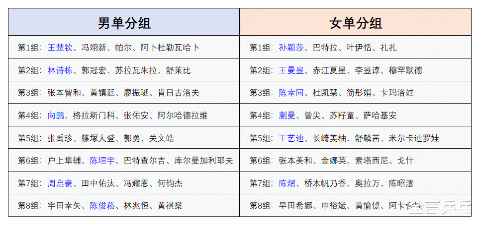 至于王楚钦、林诗栋、向鹏、孙颖莎、陈幸同、蒯曼的对手不是很强,但也有巴特拉等实力不俗的名将,也要做好被冲击的准备,以下为男女单打的详细签表: