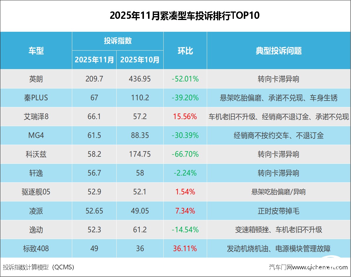 近日,汽车门网公布了2025年11月份的投诉数据。本月,汽车门网紧凑型车的投诉指数为1867.2,环比下滑了20%,投诉热度出现明显回落趋势。