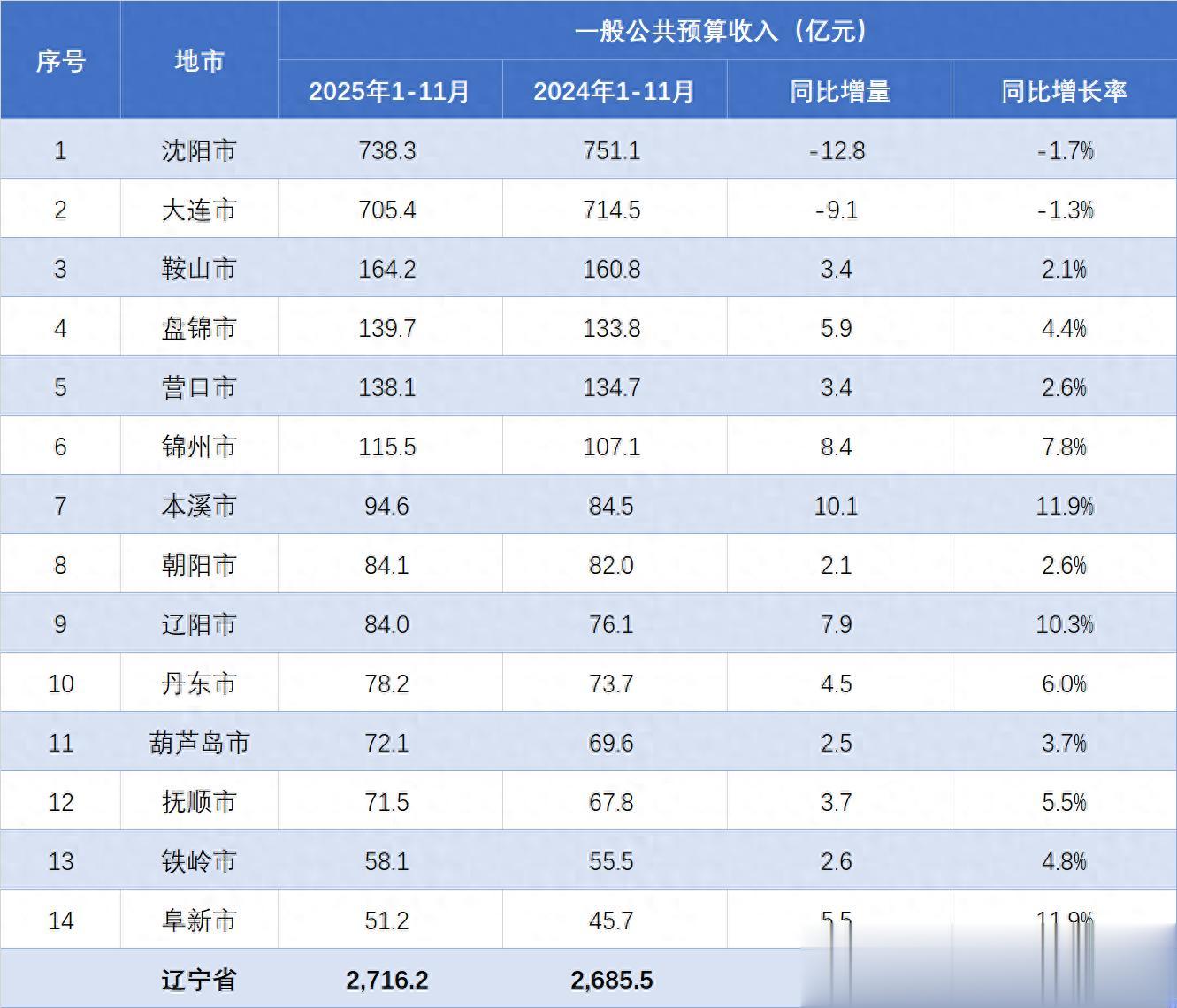 辽宁各地2025年1-11月一般公共预算收入具体数据见下表: