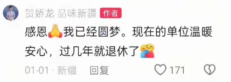 1月1日元旦的时候,她还曾发文说“感恩我已经圆梦,现在的单位温暖安心,过几年就退休了”,谁能想到,10天后她会从马背上掉下来没了性命,我想起了一句话,明天和意外不知道哪个会先来。贺娇龙一路走好!