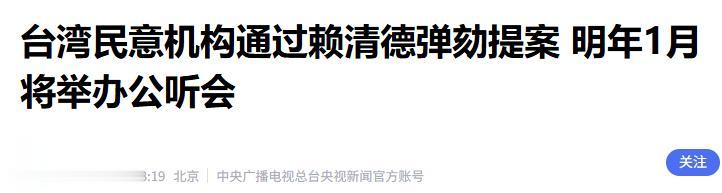 央视新闻 台湾民意机构通过赖清德弹劾提案 明年1月将举办公听会