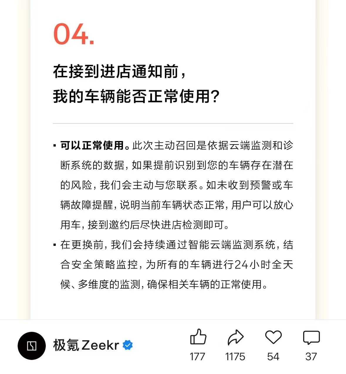没等电池问题爆发,极氪就通过云端监测,发现部分老款车型电池内阻异常,随即开展专项检测、备案召回,为相关车辆免费更换电池,换新后仍然可以享受三电质保。