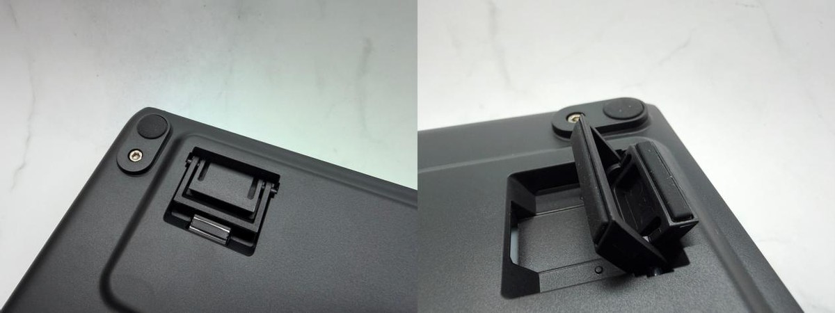 2段式设计垫脚方便不同的用户调整键盘高度,适用不同的场景需求。无线接收器设计在右侧脚垫部位,只有打开脚垫才能取出,可以有效防丢,设计非常用心。