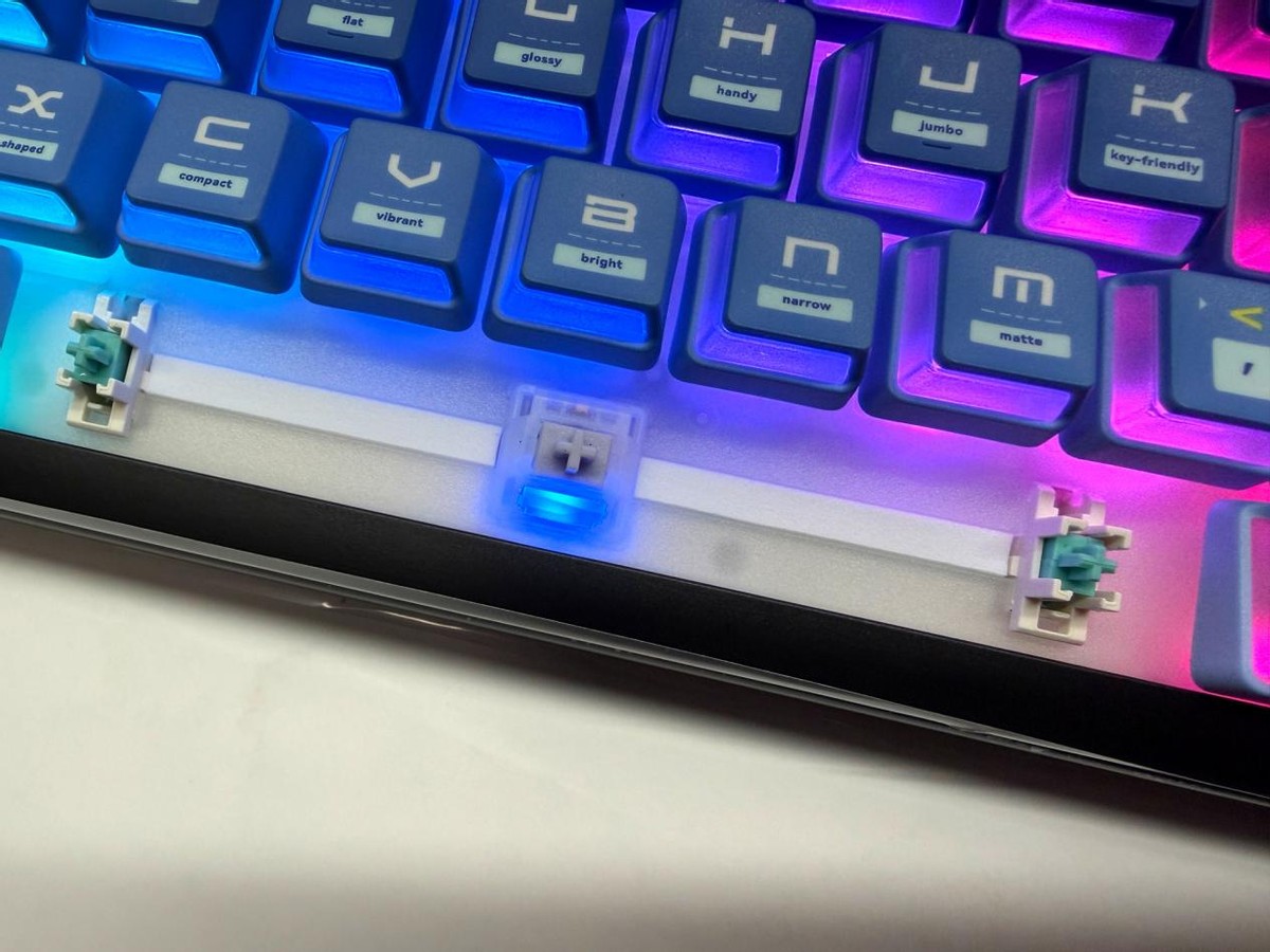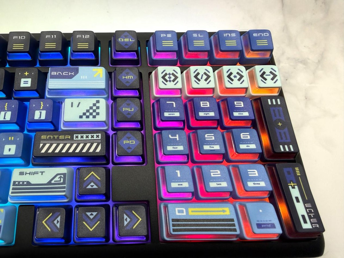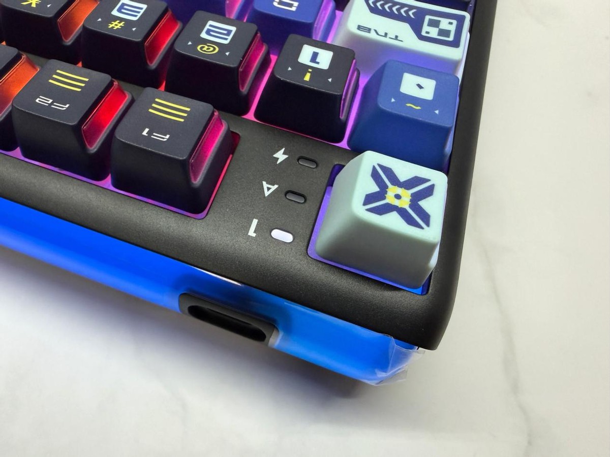 键帽采用耐磨抗打油的 PBT 材质,做工精致,触感舒适。磨砂的L 型透光键帽光效发散更好而且不刺眼,与弧面灯箱相呼应,整体灯效氛围非常棒。