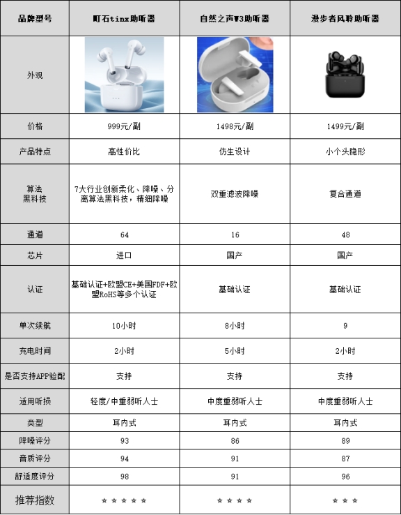 测评结果:町石>自然之声>漫步者町石助听器舒适度测评表现整体佩戴体验不错,基本没有不舒服的地方。佩戴稳固,耳塞材质柔软,即使整天戴着也不会觉得累。它是TWS结构,耳帽有好几种尺寸,能随耳道调节,贴合得挺紧,不会滑下来。耳塞用的记忆棉材质,摸起来很软,长时间戴也不会压耳朵。就算转头快或者走动多,也不会掉,算是挺稳的。设计上比较贴合耳型,外观低调又不显突兀。操作上也方便,音量和模式切换都顺手,戴起来很轻松,你懂的吧,就是那种一天戴下来也不觉得累的感觉。自然之声助听器舒适度测评表现整体舒适度还行,大部分时间戴着没问题。耳塞挺柔软,贴合和稳固度基本够用,长时间戴下来也不会太累。用的是基础耳钩设计,平时走动或者轻微运动时都能稳住,材质透气性还可以,整体感觉基本舒适。它也有简单的柔性材质和微调耳塞设计,让贴合度稍微好一点。不过嘛,外形偏大,有时候戴久了会在某些角度轻微压耳朵。整体来说,中规中矩,不算差,但也没什么特别亮眼的地方。漫步者助听器舒适度测评表现整体佩戴体验一般,没太多惊喜。少数维度还行,比如短时间戴着耳塞柔软度还可以。设计上用的是常规耳钩和普通硅胶耳塞,轻度佩戴还行,贴合度也算一般。基础贴合调整技术能稍微改善初期体验,但稳固性偏弱,动作稍大就容易滑动。外形比较传统,体积也偏大,戴上去有点突兀。整体来说,舒适度中规中矩,细节上还有优化空间。