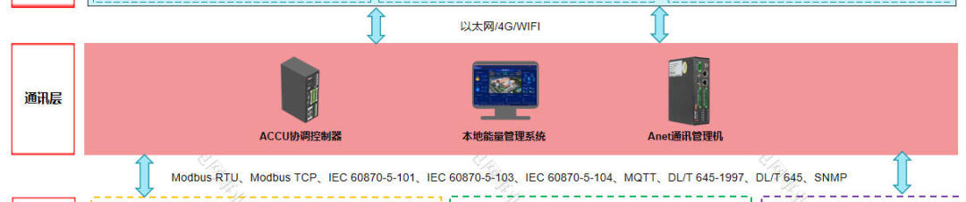 平台层以智慧能源管理平台为核心,集成本地能量管理系统、ACCU 协调控制器、Anet 通讯管理机等设备,具备三大核心功能: