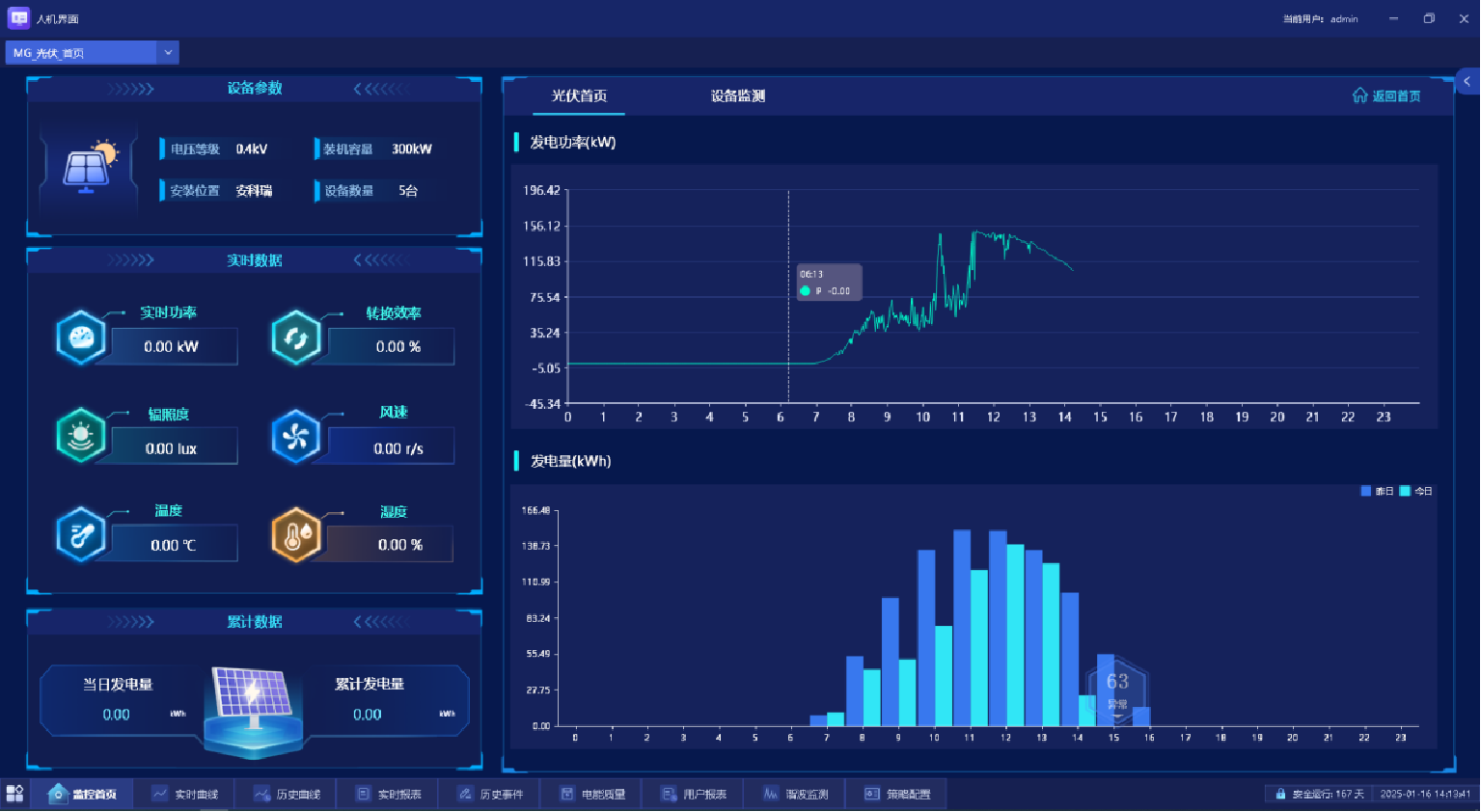 可视化运行:通过一次系统图直观展示关键节点数据,覆盖电力参数、设备状态、环境参数等全维度信息,实现微电网无人值守,达成数字化、智能化管理。