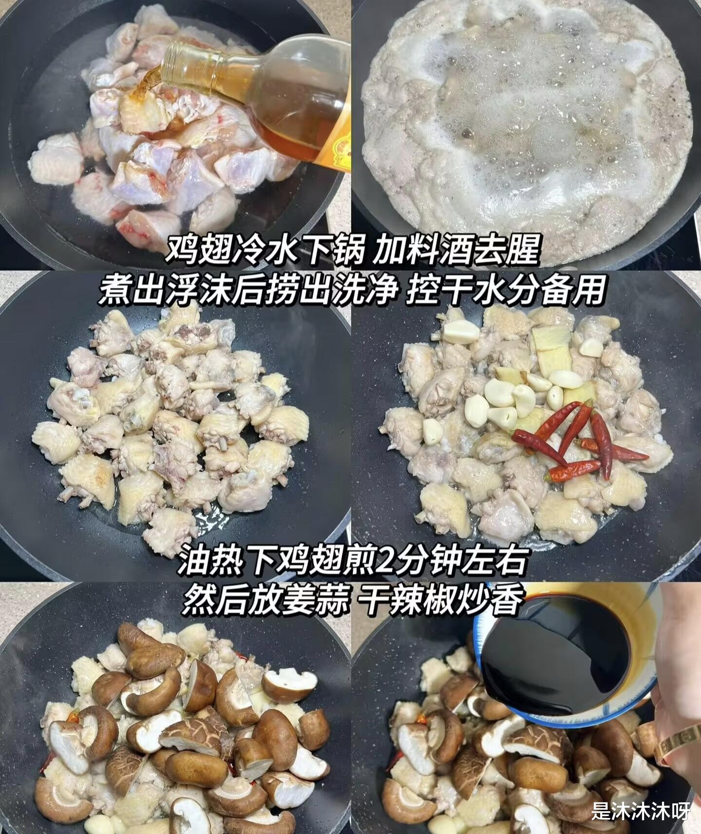 把煎好的鸡翅和切好的香菇一股脑儿倒进锅里,和姜蒜一起翻炒。这时候,香菇的香气和鸡翅的肉香混合在一起,简直要把人香迷糊了。淋入一圈料酒,沿着锅边倒下去,那“滋啦”一声,香味瞬间就被激发出来了。然后加入生抽、老抽调色调味,再来点冰糖提鲜,翻炒均匀,让鸡翅和香菇都裹上酱色。