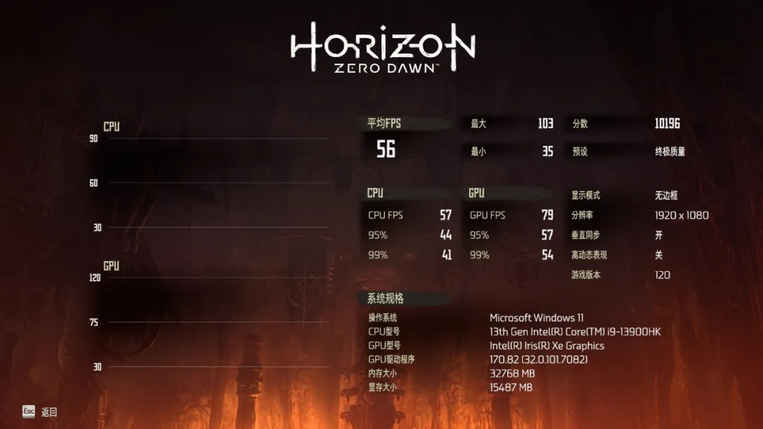 《地平线 零之曙光》终极质量画质下的平均帧数56FPS。