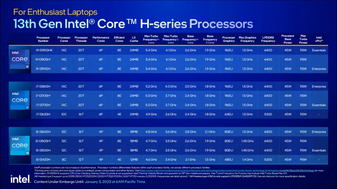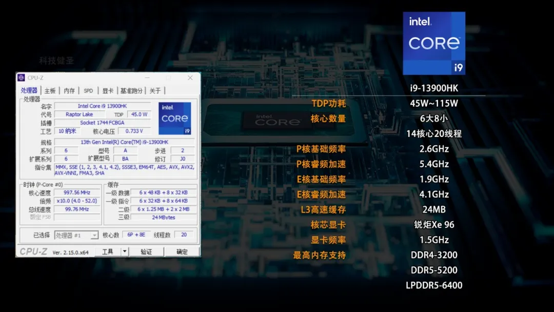 处理器虽然并非新品,但作为13代酷睿H45平台中的皇帝级处理器,i9-13900HK的规格还不错,采用6个P核心,8个E核心,共计14核心20线程,最高睿频高达5.4GHz,内置24MB高速缓存,集成锐炬Xe 96核显。从规格来看,它与英特尔去年推出的酷睿7 250H几乎一致。