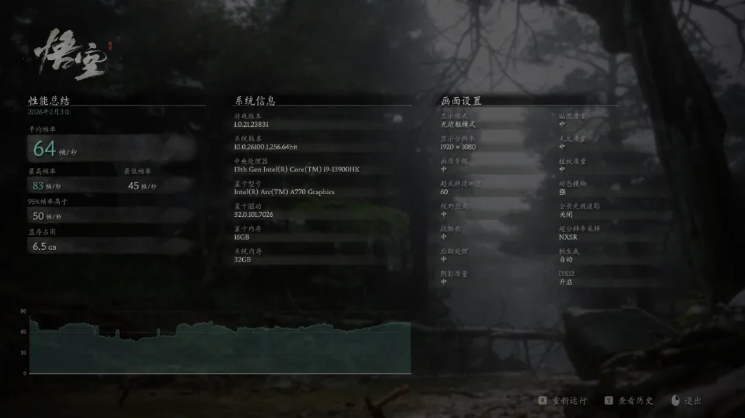 《黑神话悟空》超采样清晰度60,中预设画质平均帧数64FPS