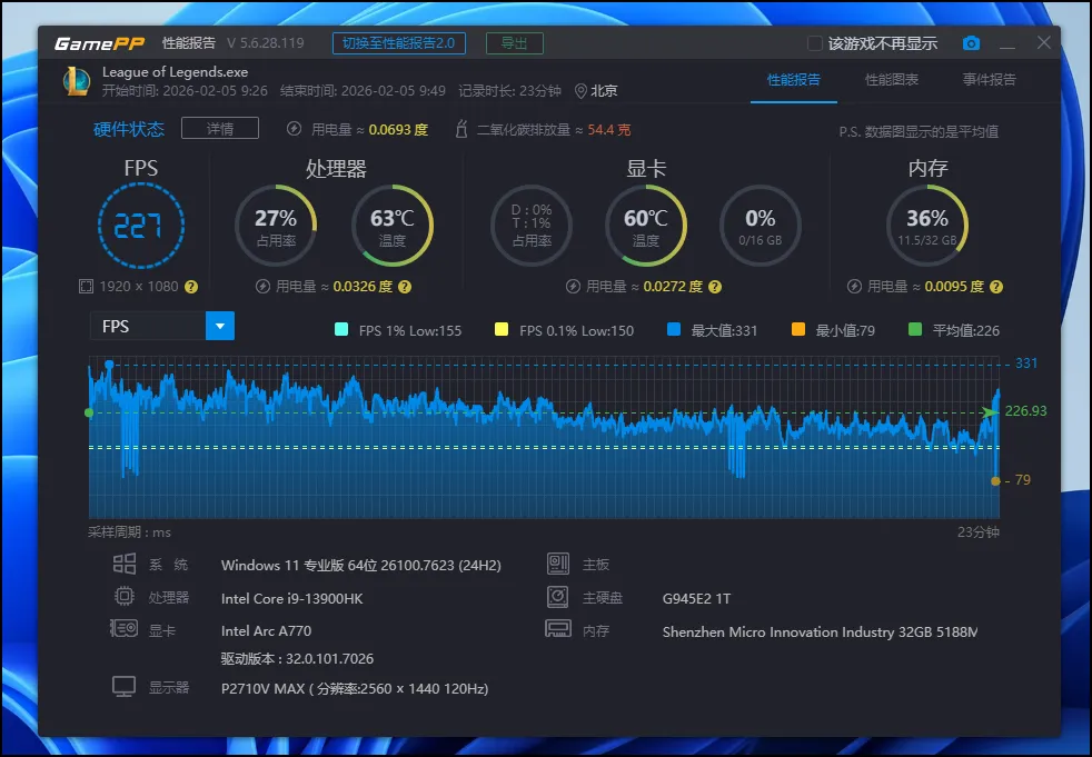 在实际游戏测试环节,分辨率都设定在1920×1080像素,《英雄联盟》极高画质平均帧数227FPS