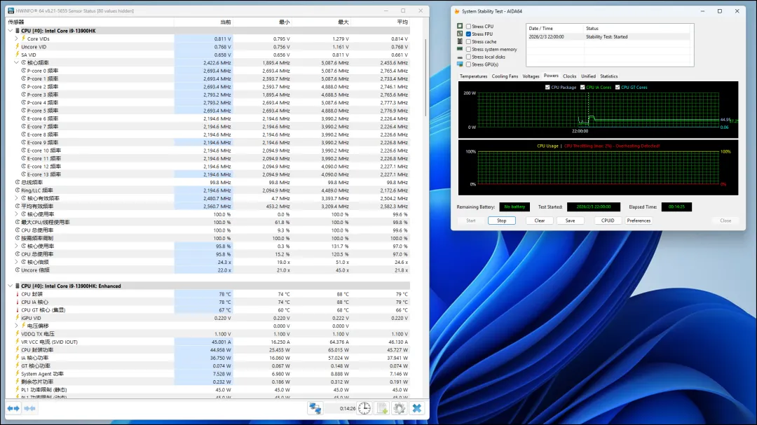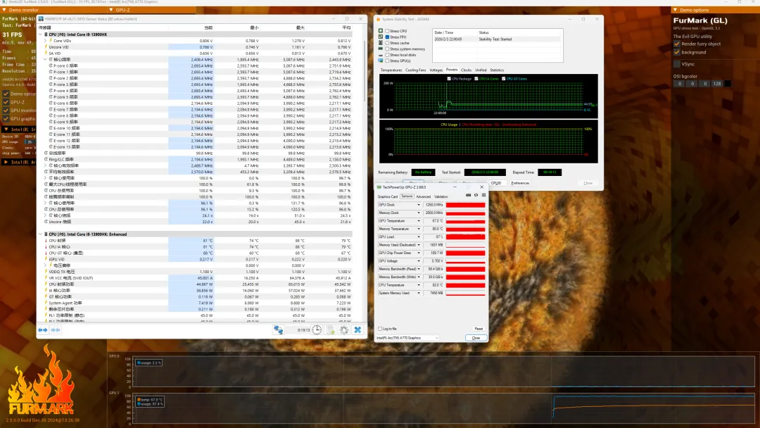 锐炫A770M无论单双烤功耗都是110W,核心频率1250MHz。双烤时CPU功耗也能一直维持在45W,合计155W。此时CPU温度81度,独显温度也只有67度,插线板上监测的整机功耗接近230W。