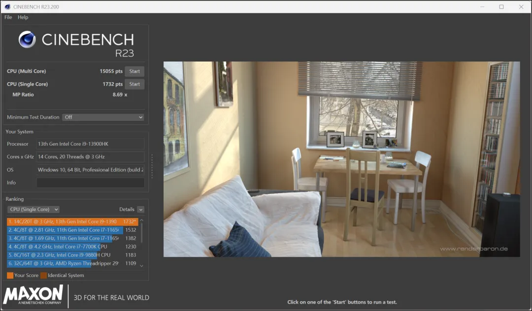 接下来就是性能实测环节了。连续运行30轮的CineBench R15,最高分2384,最低分1953,差值431,对应的就是从65W到45W之间的功耗差。