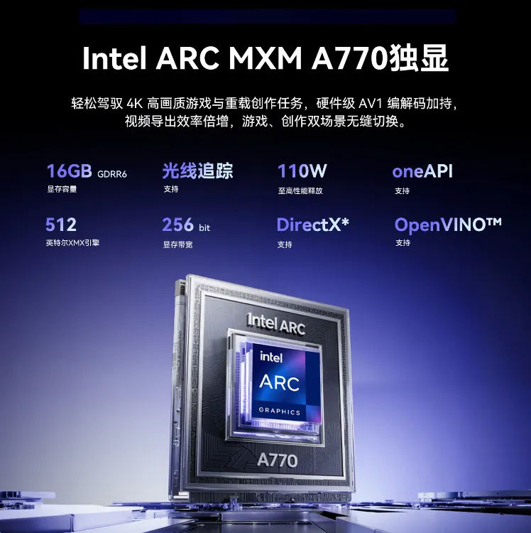英特尔锐炫A770M独立显卡,拥有完整的8组渲染切片,包含32个Xe内核(等效512个执行单元)和32个光追单元,搭配256bit位宽的16GB GDDR6显存,支持AV1视频编解码。