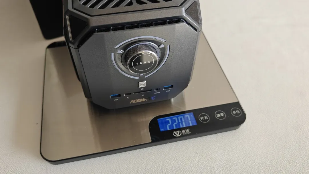 主机的尺寸约4.5L,占地空间比足球还要小一圈,在标配双内存单硬盘时的实测重量约2.2kg。电源适配器的体积有点大,希望当M1A这条产品线再次迭代时,官方可以升级为氮化镓迷你型电源吧。