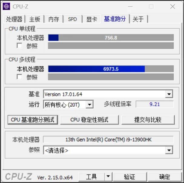 在CPU-Z中,单核和多核分数分别为756.8和6973。