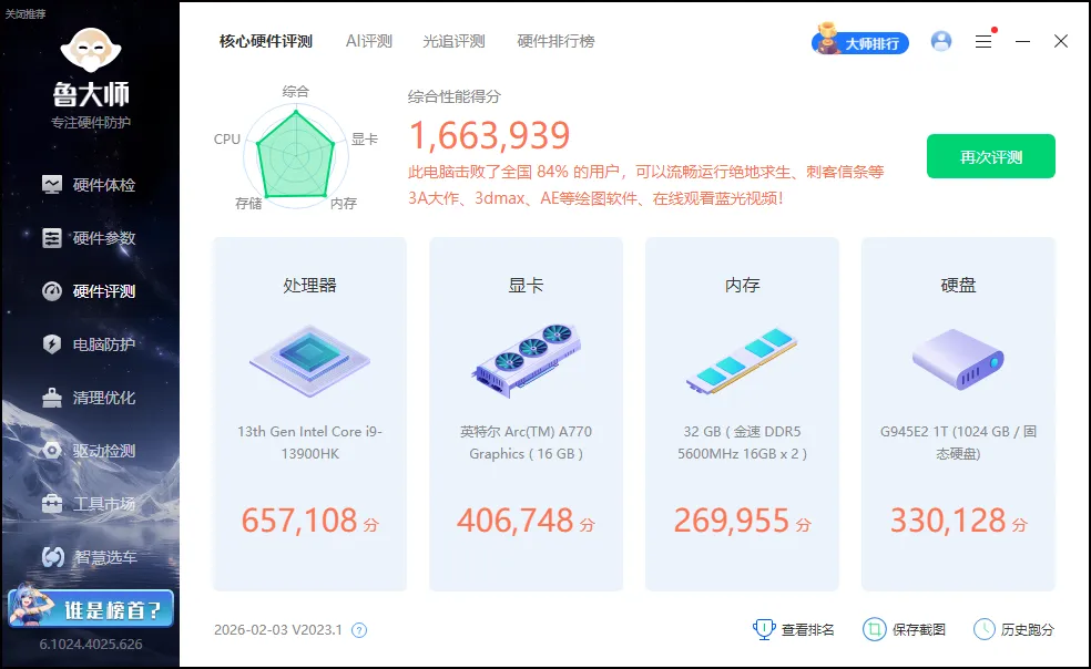 鲁大师测试总成绩166万,超过了全国84%的用户。